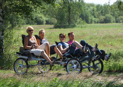 De Velorette recreatiefiets is een superlichte moderne vierwielige ligfiets voor 4 personen. Deze unieke fiets combineert het plezier en gezelligheid van het met een groep fietsen en het comfort van een ligfiets met vering. Alles en iedereen past op de Velorette recreatiefiets. De allerkleinsten kunnen mee op de te plaatsen kinderbankjes, Bagage kan worden meegenomen op de bagagedrager of in de meegeleverde picknickmand. Iedereen doet mee op zijn eigen niveau doordat ieder zijn eigen versnellingen heeft. Actief en toch relaxed fietst u gezellig samen de mooiste routes van de Achterhoek. Wij hebben verschillende routes die u langs de mooiste plekjes brengen.